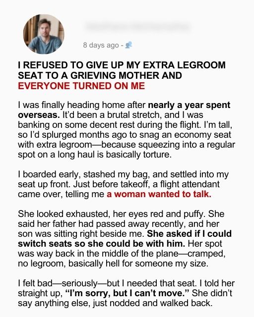 I Refused to Give Up My Extra Legroom Seat to a Grieving Mother and Everyone Turned on Me