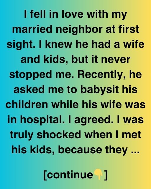 I fell in love with my married neighbor at first sight. I knew he had a wife and kids, but it never stopped me. Recently, he asked me to babysit his children while his wife was in hospital. I agreed. I was truly shocked when I met his kids, because they looked exactly like me.