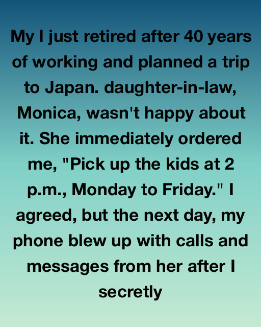 My I just retired after 40 years of working and planned a trip to Japan. My daughter-in-law, Monica, wasn’t happy about it. She immediately ordered me, “Pick up the kids at 2 p.m., Monday to Friday.” I agreed, but the next day, my phone blew up with calls and messages from her after I secretly booked my ticket anyway.