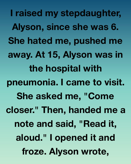 “I raised my stepdaughter, Alyson, since she was 6. She hated me, pushed me away. At 15, Alyson was in the hospital with pneumonia. I came to visit. She asked me, ‘Come closer.’ Then, handed me a note and said, ‘Read it, aloud.’ I opened it and froze. Alyson wrote,