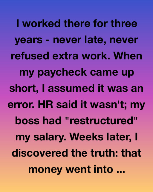 I worked there for three years โ never late, never refused extra work. When my paycheck came up short, I assumed it was an error. HR said it wasnโt; my boss had โrestructuredโ my salary. Weeks later, I discovered the truth: that money went into his daughterโs wedding fund.