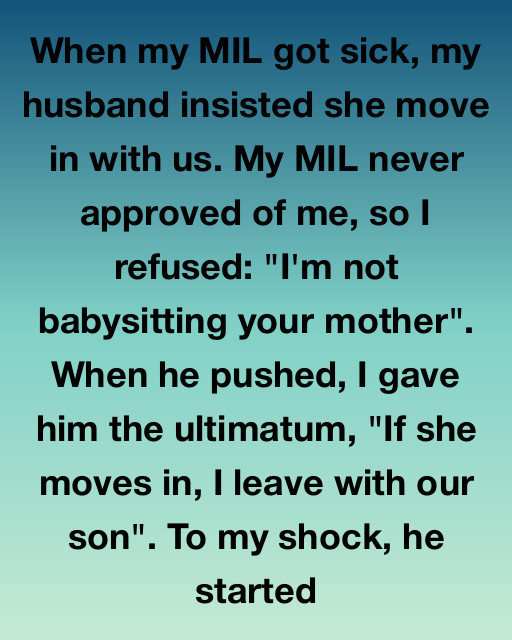 When my MIL got sick, my husband insisted she move in with us. My MIL never approved of me, so I refused: “I’m not babysitting your mother”. When he pushed, I gave him the ultimatum, “If she moves in, I leave with our son”. To my shock, he started packing his suitcase and immediately arranging childcare for our son.