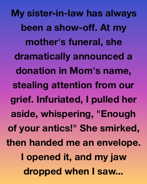 My sister-in-law has always been a show-off. At my mother’s funeral, she dramatically announced a donation in Mom’s name, stealing attention from our grief. Infuriated, I pulled her aside, whispering, “Enough of your antics!” She smirked, then handed me an envelope. I opened it, and my jaw dropped when I saw a photograph inside.