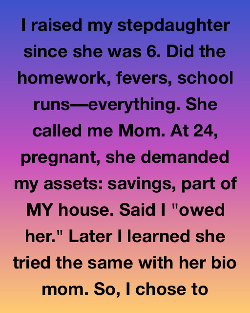 I raised my stepdaughter since she was 6. Did the homework, fevers, school runsโeverything. She called me Mom. At 24, pregnant, she demanded my assets: savings, part of MY house. Said I “owed her.” Later I learned she tried the same with her bio mom. So, I chose to force her to confront the true cost of dependency, giving her an asset she never asked for but desperately needed.