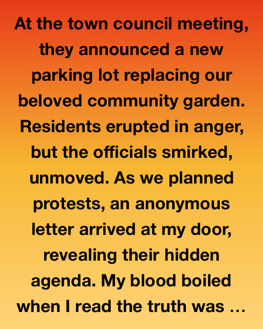 At the town council meeting, they announced a new parking lot replacing our beloved community garden. Residents erupted in anger, but the officials smirked, unmoved. As we planned protests, an anonymous letter arrived at my door, revealing their hidden agenda. My blood boiled when I read the truth was the land was secretly sold to a chain development agency.