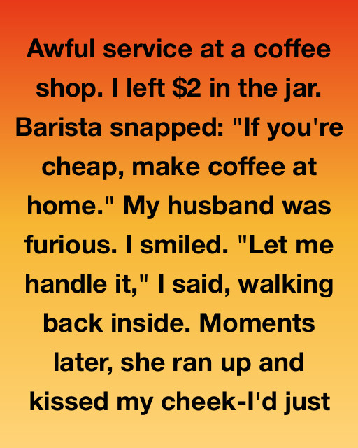 Awful service at a coffee shop. I left $2 in the jar. Barista snapped: “If you’re cheap, make coffee at home.” My husband was furious. I smiled. “Let me handle it,” I said, walking back inside. Moments later, she ran up and kissed my cheekโ€”Iโ€™d just paid off the shopโ€™s overdue utility bill, solving the immediate crisis that was ruining her life and her attitude.