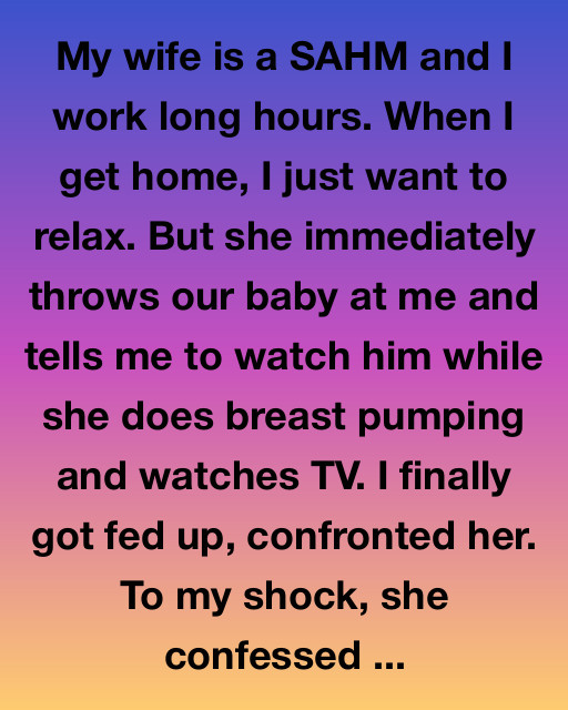 My wife is a SAHM and I work long hours. When I get home, I just want to relax. But she immediately throws our baby at me and tells me to watch him while she does breast pumping and watches TV. I finally got fed up, confronted her. To my shock, she confessed she felt like she was losing herself, and watching TV while pumping was the only moment in her day that felt remotely hers.